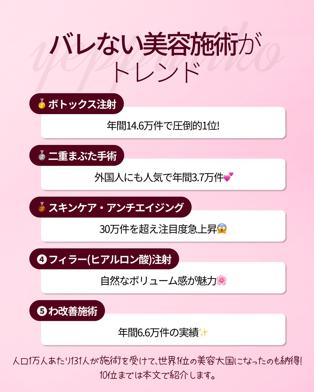1️⃣ ボトックス注射:年間14.6万件で圧倒的1位!